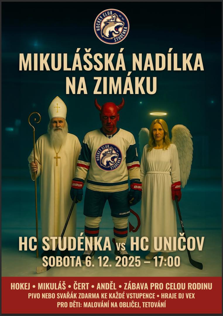 V rámci utkání KLM HC Studénka vs. HC Uničov se můžete těšit na bohatý doprovodný program! Mikulášská nadílka bude skvělou akcí, která spojuje sportovní zápas s vánoční atmosférou a radostí pro všechny návštěvníky. Během této akce se můžete těšit na speciální mikulášskou nadílku, která je určena především pro děti, ale i pro všechny fanoušky a návštěvníky. Ke každé zakoupené vstupence obdrží dospělá osoba zdarma pivo nebo svařák. Po celou dobu této akce hraje DJ VEX!